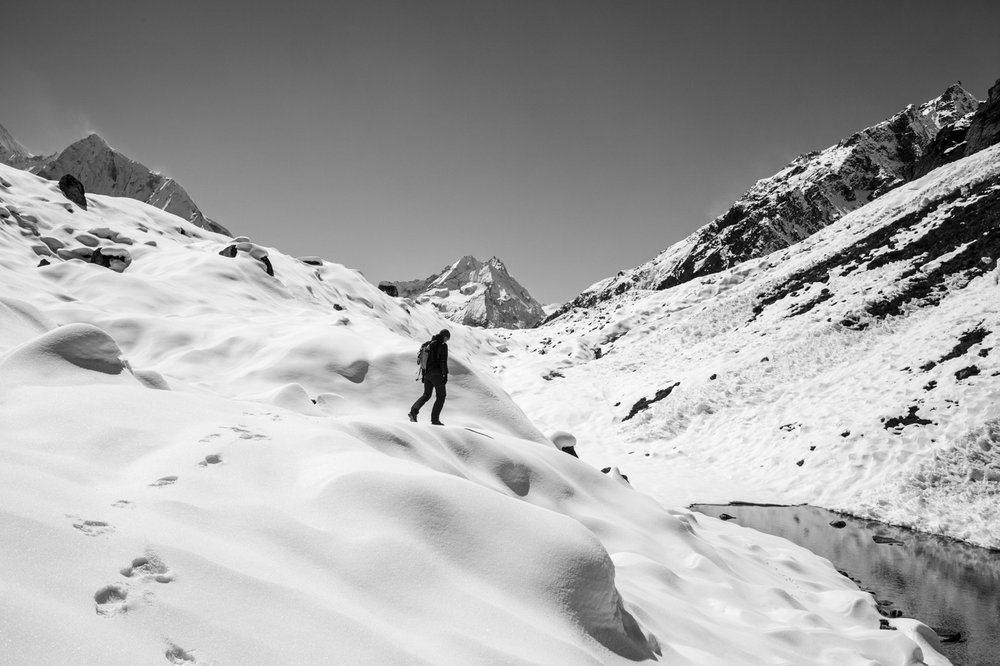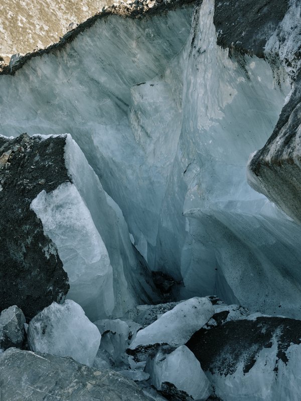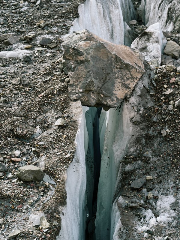 FP: You smell the thin air in the mountains. There is purity, visually and in all the senses. You can hear the sound of mountains: rock and water. Clean ice glaciers sound different from glaciers covered with debris. It’s a very particular sound, hearing the rocks shifting and colliding under your feet as you walk on them. Walking on rolling stones requires concentration and balance, it is like a meditation. When you walk on the ice with crampons, you also hear the thinnest ice on the surface being crushed by the crampon spikes. Sometimes we hear avalanches from higher glaciers bringing snow down into the valley. The air in the mountains smells fresh—and it’s usually very cold!