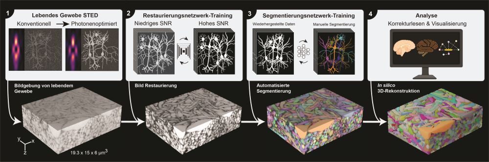 Ansätze mit Super-resolution Light Microscopy (aus dem Englischen: superauflösende Lichtmikroskopie) durchbrechen diese Auflösungsgrenze. Die jüngsten Arbeiten in diesem Feld sind vielversprechend. „SUSHI“ (Super-resolution Shadow Imaging) beispielsweise kombiniert das Einfärben der Zellzwischenräume mit Farbstoffmolekülen mit der Nobelpreis-ausgezeichneten Superresolution-Technik STED (Stimulated Emission Depletion). Dadurch können superaufgelöste „Schatten“ der zellulären Strukturen offenbart werden und können so im Gewebe sichtbar gemacht werden. Trotzdem war es bisher nicht möglich, ganze Gehirnvolumina mit einer verbesserten Auflösung, die der komplexen 3D-Architektur des Gehirngewebes entspricht, abzubilden. Der Hauptgrund dafür ist, dass die höhere Auflösung auch eine hohe Lichtbelastung der Probe mit sich bringt, was dazu führt, dass das lebende Gewebe beschädigt wird oder gar „verschmort“.